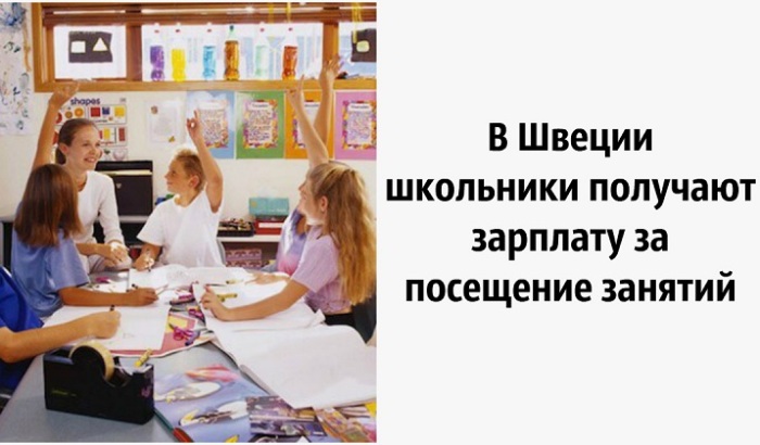 Чтобы стимулировать любовь к учебе, власти Швеции платят школьникам. Ежемесячно каждый школьник страны получает 187 долларов на канцелярию и личные нужды. Такое решение помогло быстро справиться с прогулами и обеспечить практически 100 процентную посещаемость в государственных школах Швеции.