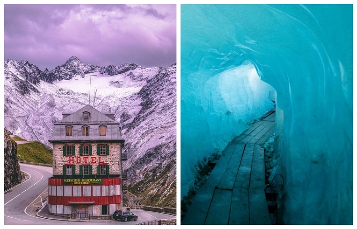 Он вырезан из самой чистой части ледника Рона, которому насчитывается более 11 000 лет. В его глубинах замерзшая вода настолько чиста, что в ней не найдете ни единого камешка. Это рукотворное творение вырублено на глубине около 100 метров и когда солнечный свет проникает сквозь его кристаллы, весь туннель освещается невероятным синим светом. Этот перевал не единственная достопримечательность Швейцарии, о ее живописных местах, памятниках культуры и архитектуры уже не раз писалось на страницах Novate.ru.