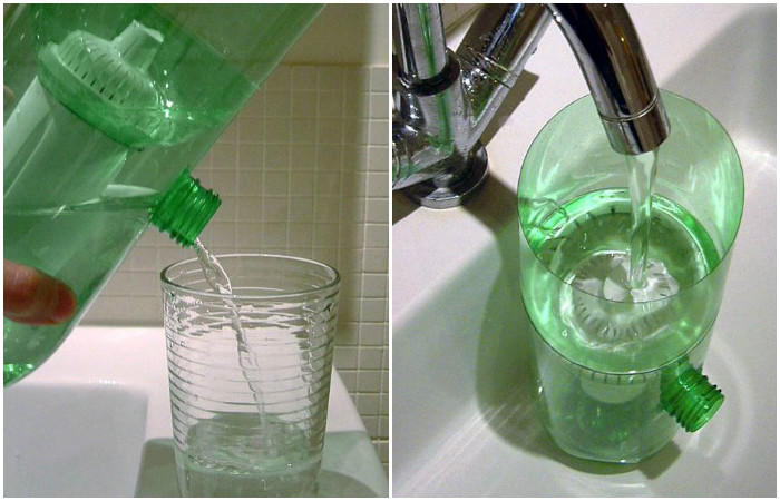 Переверните верхнюю половину «горлом» вниз и вставьте в нижнюю. Между ними закрепите картридж для фильтра (в оригинальной инструкции использовался Аквафор B100-6). Отрезанное горлышко установите в отверстие и закрутите крышку – оно будет служить «краном».