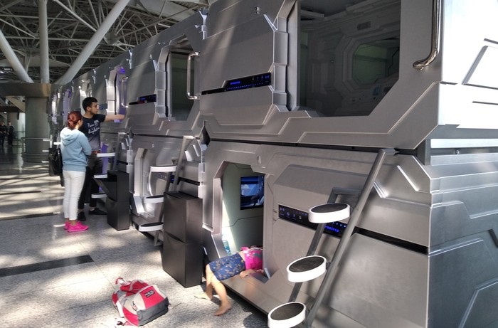 Внутри двухэтажной капсулы для отдыха в транзитной зоне.